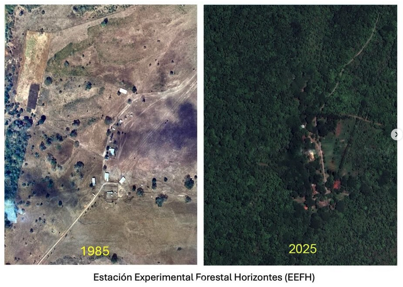 Ein anschauliches Beispiel für den Erfolg unserer Schutzbemühungen sieht man beim Vergleich zweier Satellitenbilder von 1985 und 2025. Die ehemals stark gerodete Fläche ist inzwischen von dichtem Sekundärwald bewachsen: