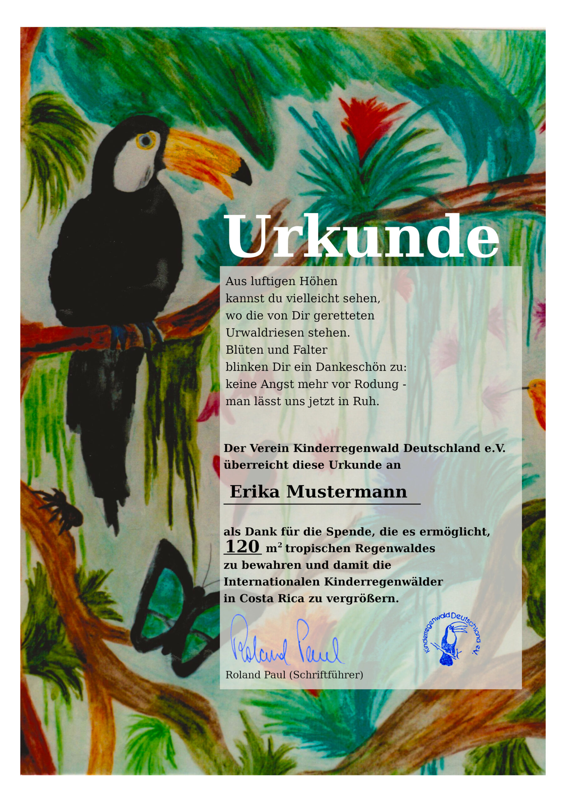 Spende einen Betrag deiner Wahl zur Rettung der tropischen Regenwälder auf das Konto von kinderregenwald.de. Nenne den Namen des Beschenkten und deine E-Mailadresse im Kontaktformular. Du bekommst dann eine digitale Urkunde zum Ausdrucken über ein Stück tropischen Regenwald im „Ewigen Wald der Kinder“ zugeschickt: